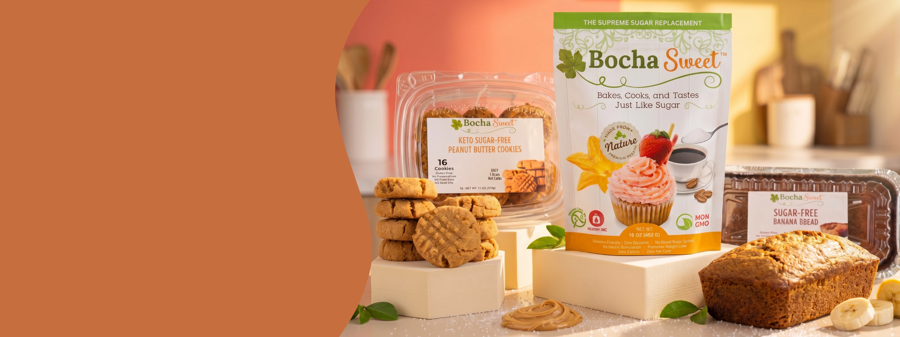 Select from our baking mixes, BochaBars, sweeteners, ready-to-eat baked treats and cookies.