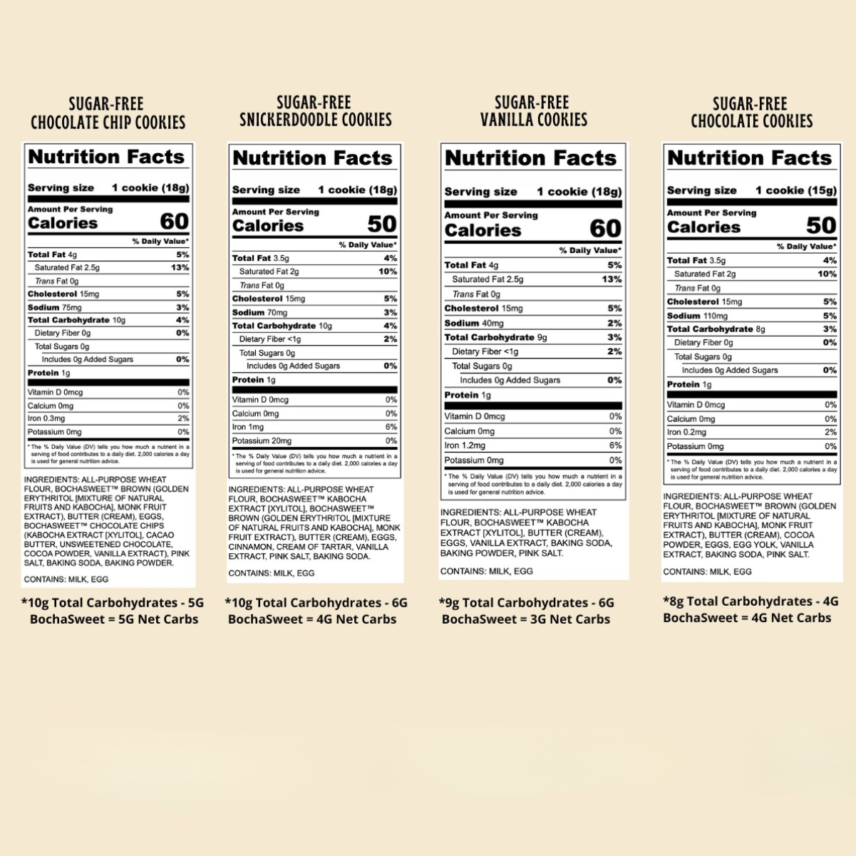 Yes! Our cookies and breads are sweetened with BochaSweetâ„¢ and contain no cane sugar, no artificial sweeteners, and no weird aftertaste. We have cookies made with premium all-purpose wheat flour or gluten-free flours (depending on the bundle you choose).